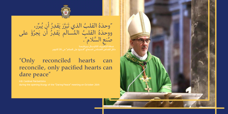 “Only those who recognize their fragility and need for mercy can become instruments of reconciliation…. Only justified hearts can justify. Only pacified hearts can dare to make peace,” said His Beatitude Cardinal Pierbattista Pizzaballa, Latin Patriarch of Jerusalem, in his homily at St. John Lateran in Rome, on October 26th, 2025, as he presided over the Eucharistic Liturgy, which opened the International Meeting organized by Sant’Egidio entitled “Dare Peace”.