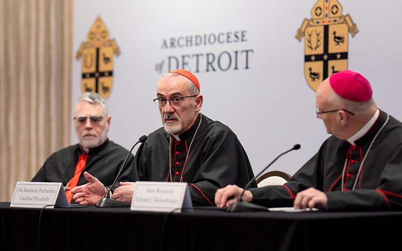 It came on the second day of Cardinal Pizzaballa’s four-day pastoral visit to southeast Michigan at the invitation of Detroit Archbishop Edward J. Weisenburger, who, along with Bishop Francis Y. Kalabat of the Chaldean Eparchy of St. Thomas the Apostle, joined the cardinal at the event. All three prelates addressed members of the local media during the news conference.