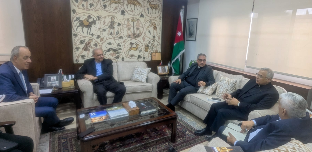 Minister of Tourism and Antiquities Imad Hijazeen received, Monday, a high-level delegation of evangelical leaders in Amman on Monday. The meeting focused on cooperation and coordination, particularly in increasing Christian tourism to Jordan. The minister welcomed Rev. Attorney Botrus Mansour, the new Secretary General of the World Evangelical Alliance, which includes 650 million evangelical Christians worldwide, as well as Pastor Dr. Nabeeh Abbasi, Ambassador of the World Baptist Alliance for the Middle East, and Pastor Dr. Jack Sara, President of Bethlehem Bible College.
